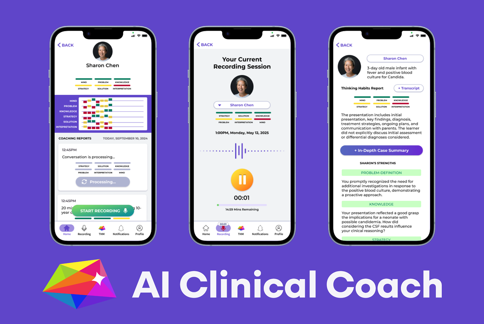 AI Clinical Coach is an app I designed with a team dedicated to investigating how to teach thinking skills in medical education and clinical workplaces.