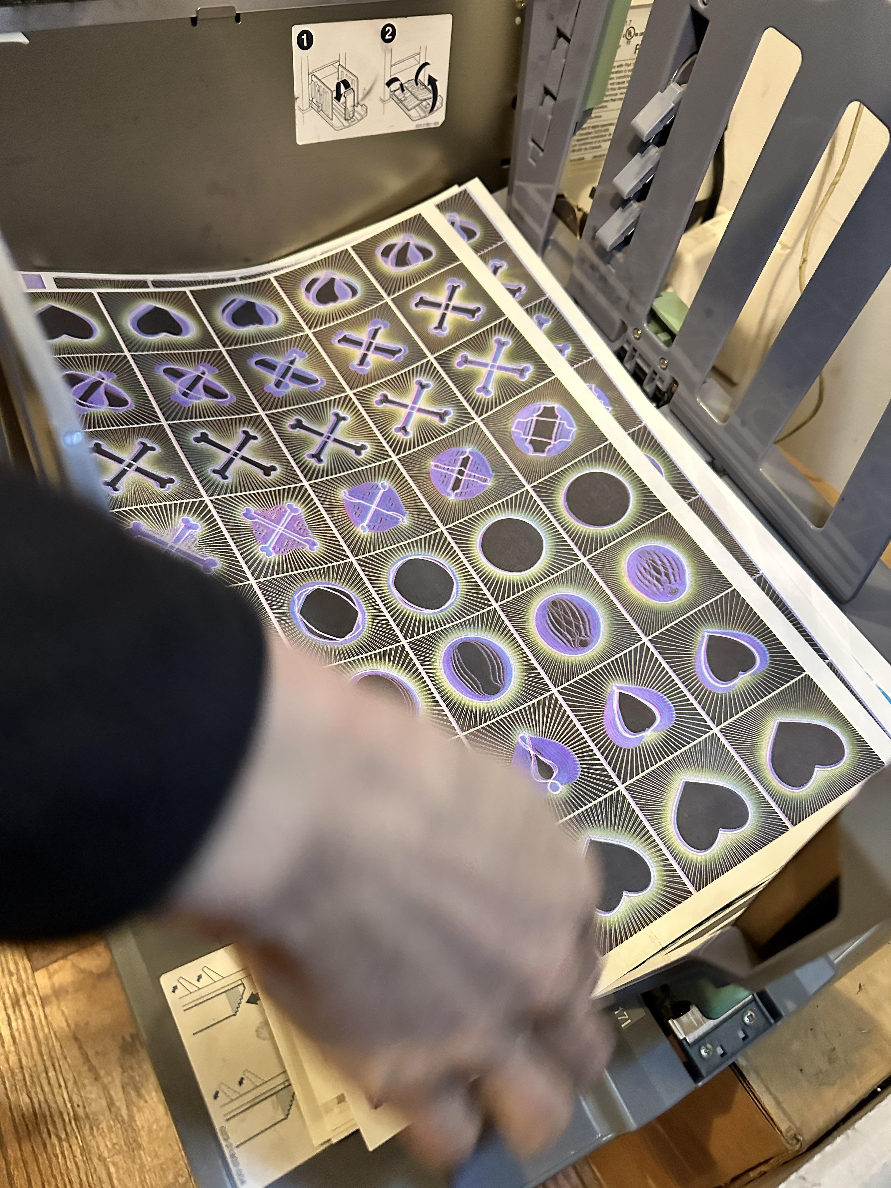 The digital animation is first translated into a contact sheet, ideally optimized to fit on a standard sheet of paper to reduce waste. The contact sheet of animation frames is then color separated into separate files corresponding to each ink that will be used in the risograph printing process. Typically, less is more; it is very difficult to register 4 or more inks, so you have to get creative about how you can combine as few colors as possible to produce the animation. In our case, we used yellow, pink, and blue. When combined, they also formed orange, green, purple, and black.