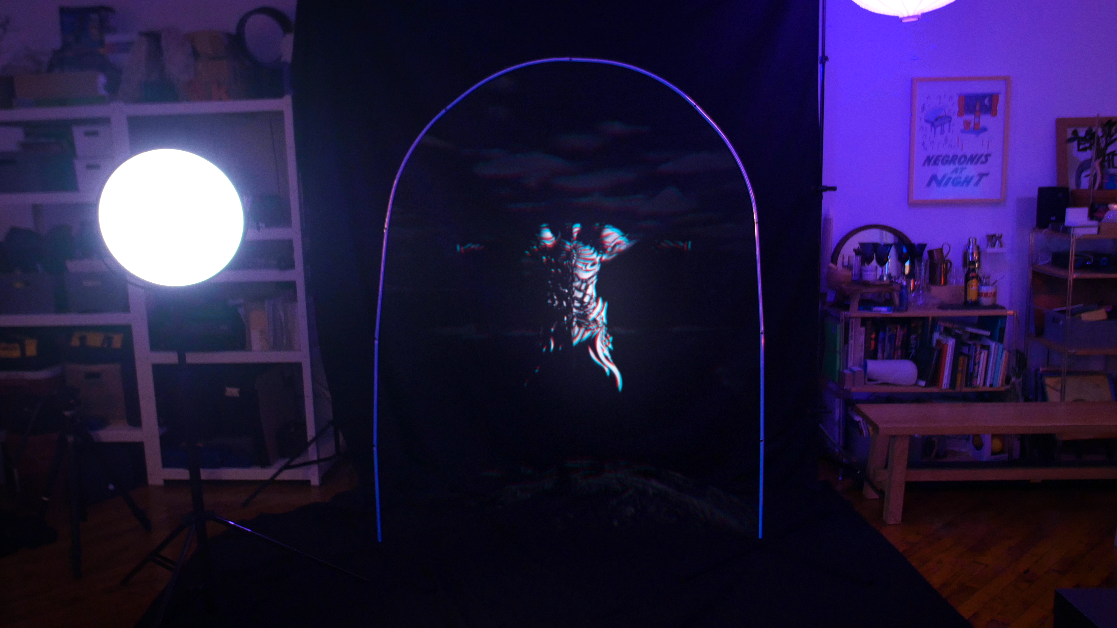 This is a music video I made for the second single from Snakeskin's 2024 album, Summoning Suit. In the video, Snake is at home facing a mysterious holographic archway she is controlling with the sound of her synthesizer. Static and images appear within it as she adjusts the dials and sings a few simple lyrics over and over again, “There’s a single sobbing key on my keyboard…” The imagery never resolves, and the experiment seems to fail. Looking out the apartment window, a red sky is spotted with floating creatures we call winchmimes. The apartment is detached and flying through the air in a crystalline force field, shepherded by a gigantic bird made of light. Returning to the arch, Snake sings the lyrics once more, dancing as the synthesizer melodies become voice-like and powerful. Like the light from a distant lighthouse, a signal flashes and sounds from the arch. The image is resolving itself. The silhouette of a suit of armor. A glacier. Snake is there in the image. Is this what she is looking for? She steps into the arch and vanishes. Wasabi was filmed at home in Williamsburg during the pandemic.
